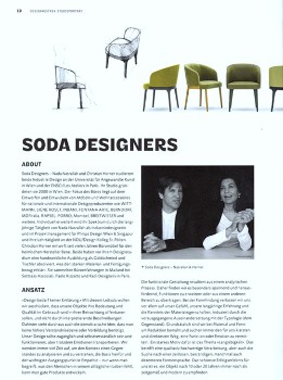 Design kann vieles, aber nicht alles. Design braucht eine funktionierende und florierende Industrie. Das macht die Sache in Österreich nicht gerade einfach. Es gibt aber mittlerweile eine bemerkenswerte Anzahl kleinerer und mittlerer Betriebe, die überaus erfolgreich Design in ihre Produktionsprozesse integrieren. Und es gibt auch verstärkt Ansätze, Design und den Begriff Design öffentlich zu fördern, zu professionalisieren. €žDas finden wir gut. Design war in Österreich immer ein offener Begriff. Er hat sich immer über Architektur und Kunst definiert. Wenn sich ein Staat, die öffentliche Hand, dazu entschließt zu fördern, dann bedeutet das auch, es wird bewertet. Und wenn jetzt Geld zur Verfügung steht bzw. stand, dann hat das auch mit dem Wert von Design zu tun. Das ist ein ganz einfaches Prinzip. Man muss sich von der Vorstellung verabschieden, dass Design im stillen Kämmerchen und in limitierter Auflage passiert. Das hat nichts mit Design zu tun. €œ Allerdings sind Förderungen noch lange keine Garantie für ein gelungenes Produkt. €žSie ermöglichen aber den Designern, den wirklich kostspieligen Entwicklungsprozess eines Produktes zu Ende zu führen. Ein Produkt hat eine Entstehungszeit von zumindest ein bis zwei Jahren und manchmal auch länger. Die muss finanziert werden. Am Ende kann (!) ein qualitativ gutes Produkt stehen. €œ Wenn es allerdings um das Bewusstsein für gutes Design geht, sehen die Soda Designers in Fördergeldern keine adäquate Lösung. €žDa geht es um Bildung, darum, den Begriff Design zu hinterfragen, mehr Inhalte hineinzubringen und bestehende zu überprüfen. Man kommt in diesem Zusammenhang auch nicht darum herum, unser Konsumverhalten zu analysieren und zu hinterfragen. Es kann nicht darum gehen, etwas nur zu kaufen, weil es neu ist und/oder weil Design drauf steht. Wenn wir an diesem Punkt verharren, dann hat sich nichts verändert und nichts bewegt. Das mündet im schlechtesten Fall in einen formalen Einheitsbrei ohne Inhalte. Altes einfach neu verpackt. Und es geht darum, zu vermitteln, dass Design nicht auf alles eine Antwort hat. Vor allem nicht auf emotionaler Ebene. €œ Das heißt: Design ist Orientierungspunkt, aber es bleibt immer die Offenheit der individuellen Bewertung, der Wertigkeit, die man einem Produkt beimisst. Das kann natürlich verunsichern, wenn man nicht gelernt hat, dem konsumorientierten gesellschaftlich geltenden Wertekatalog seinen eigenen gegenüberzustellen. €žIdealerweise kann es nur darum gehen, Menschen dazu zu bewegen individuelle Entscheidungen zu treffen. Den Mut und die Sicherheit dazu zu gewinnen. Und wenn sie dann mit unserem Design nichts anfangen können, dann ist das für uns auch in Ordnung. Wir sehen eine Gefahr in der Tatsache, dass wir in unserer Gesellschaft ständig damit beschäftigt sind, uns neu zu positionieren und, damit verbunden, einer Gruppe zuzuordnen. Es ist nicht nur die Werbung, die hier Stilfragen beinahe zu Glaubensfragen hochstilisiert. Wir sehen durchaus auch die teils problematische Position von Designern. Kurz: Wir halten den momentanen Wert, den Kult um Designer und Design, für überzogen. Philippe Starck bezeichnete sich selbst in diesem Zusammenhang als Nutznießer, wenn auch nicht ohne Ironie. €œ