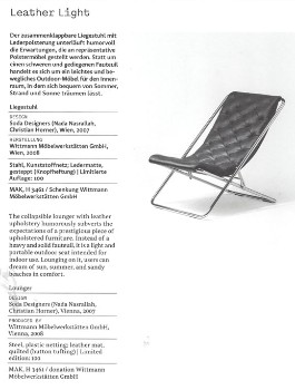 Das Unternehmen blickt aber auch in die Zukunft und engagiert sich für die Jungen. Das Wiener Duo Soda Designers entwarf das Sofa "York", ein komfortables Möbel mit dicken, weichen Kissen und verschiebbarer Sitzfläche. Experimenteller gaben sich die beiden Soda-Designer Nada Nasrallah und Christian Horner während der Vienna Design Weeks. Dort zeigten die bereits mehrfach ausgezeichneten Gestalter, die auch für MDF Italia, Rapsel und Ligne Roset tätig sind, im Showroom von Wittmann eine Luftmatratze, einen Schwimmring und einen Liegestuhl - alles aus handgenähtem schwerem Leder. "Wir wollten das hochwertige, an gediegene Innenräume gebundene und eher statische Ledermobiliar mit einer Portion improvisierter Campinglaune durchmischen", sagt Nada Nasrallah. Dieses Garten- und Strandmobiliar für den Innenraum orientiert sich an Wittmannschen Qualitäts- und Materialstandards, feiert aber zugleich das Leichte, Mobile und sogar Aufblasbare. Der Liegestuhl überzeugte auch Wittmann: Derzeit wird geprüft, ob der Stuhl in Produktion gehen soll...